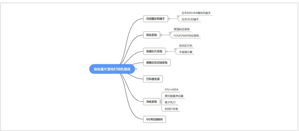 通過機械手搬運晶片,用特定激光器在晶片指定位置打標,實現對晶片的自動標記。可實現軟打標和硬打標??纱驑税雽w材料覆蓋:、Si、SiC、GaAs、InP、Al2O3(藍寶石)、Ge等材料。